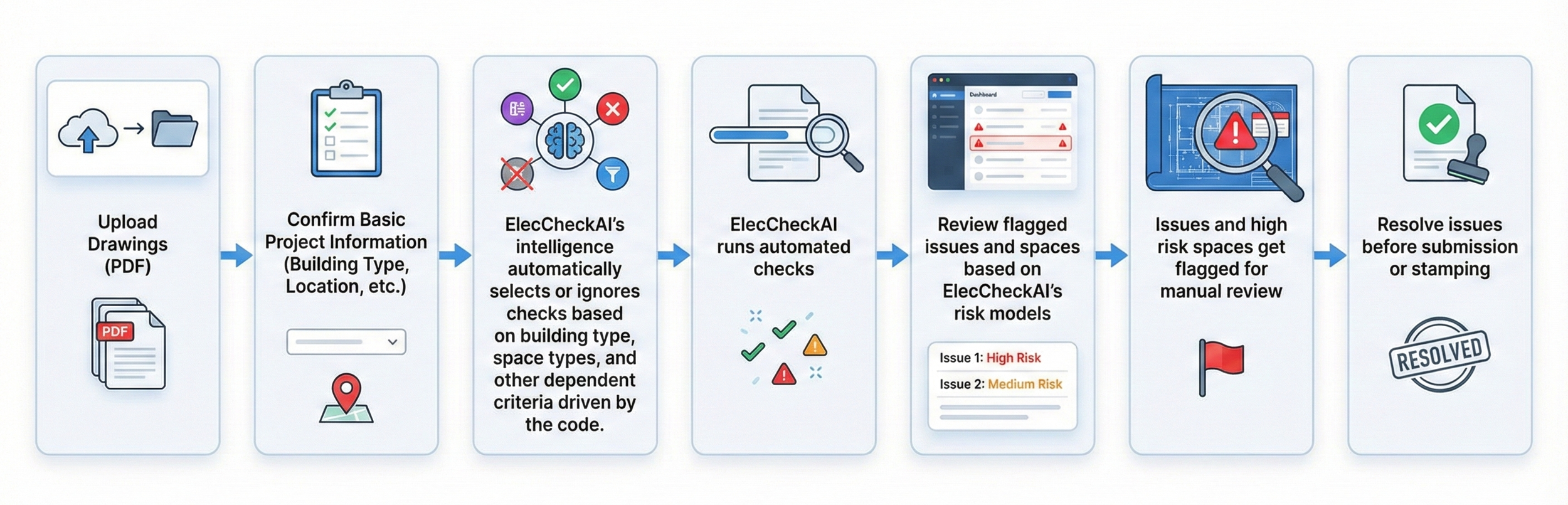ElecCheckAI reviews results and flags issues and spaces based on ElecCheckAI’s risk models